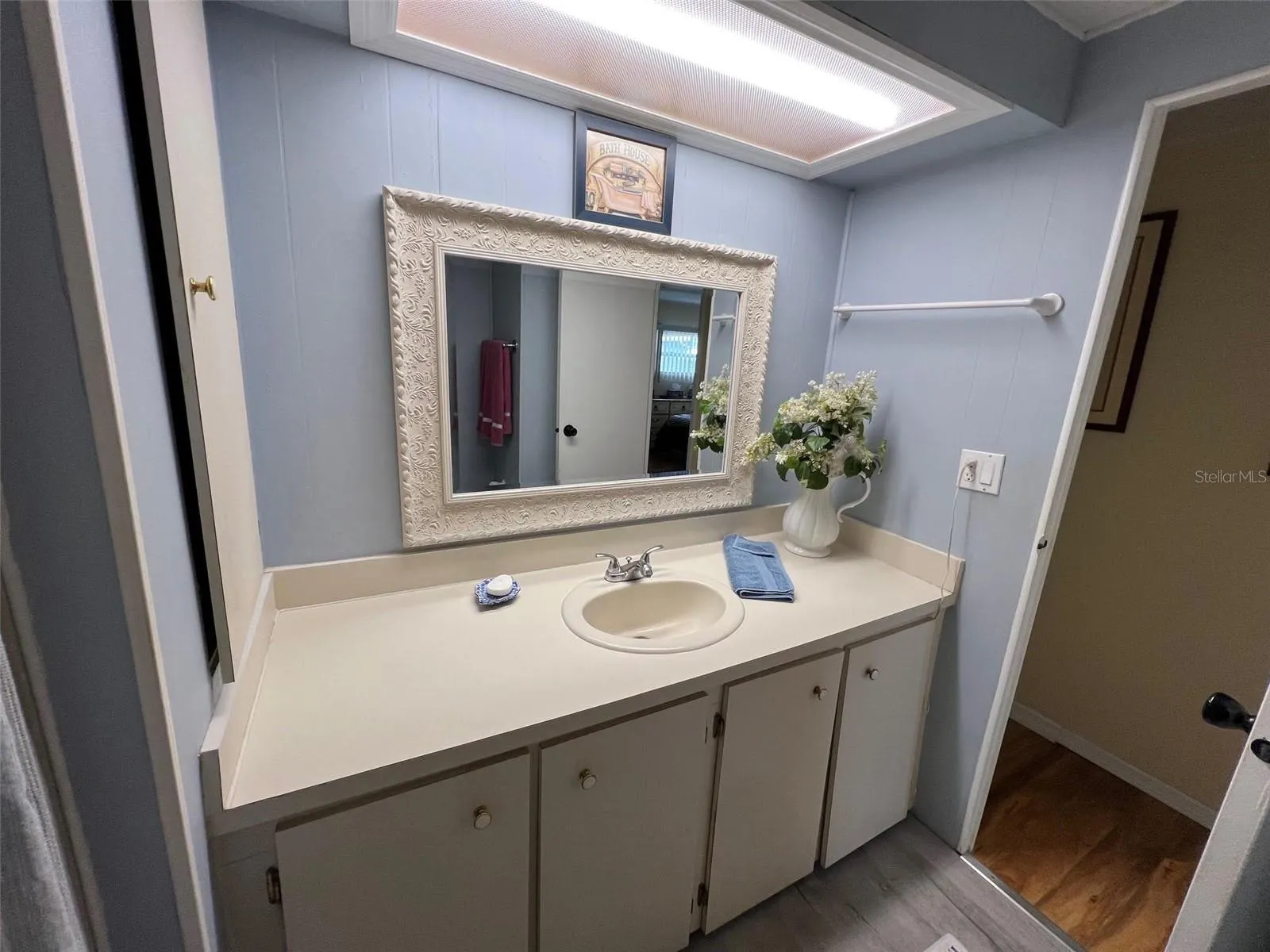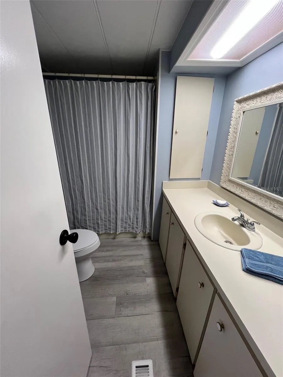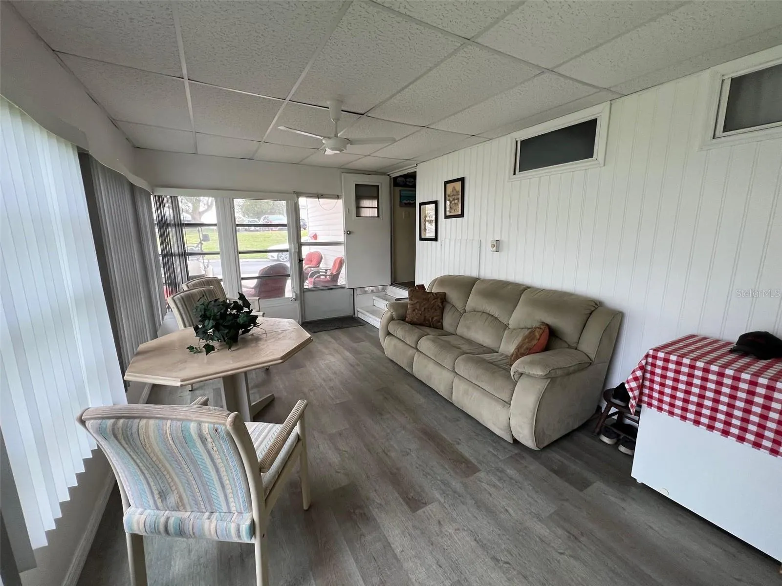 Allow me to guide you through this property, situated in this desirable location. Upon entry, the fully furnished interior immediately impresses with its neat kitchen, complete with a refrigerator, range, oven, and microwave. Durable laminate flooring spans most of the home, seamlessly transitioning into stylish vinyl planks in the kitchen and baths. Ceiling fans are thoughtfully installed throughout, and plentiful storage options ensure that every item finds its place. The dining room, featuring an elegant hutch, offers a refined setting for meals, while the expansive open living room flows into an adjacent raised Florida room via sliding decorative glass doors—perfect for enjoying the benefits of both indoor and outdoor living. With a new roof for the raised Florida room on the horizon, added peace of mind awaits. The sizable primary bedroom serves as a private retreat with an ensuite bathroom complete with a walk-in shower, and the guest bedroom, light and bright with a large closet, provides additional contentment. The guest bathroom, equipped with both a tub and a shower, further underscores the home’s practical design and accessibility.