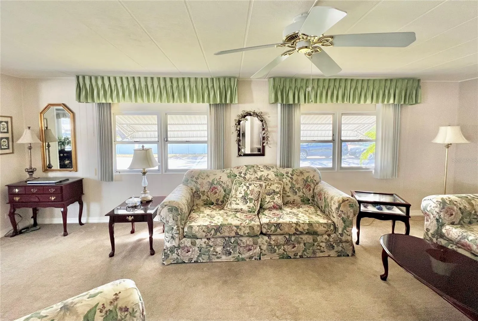 WOW>>> PRICE REDUCED AND SELLERS are OFFERING a $5,000 CREDIT FOR CARPET ALLOWANCE… CHOOSE YOUR OWN FLOORING ONCE YOU PURCHASE AND HAVE IT INSTALLED BEFORE YOU MOVE IN!!! Welcome to this charming 2-bedroom, 2-bathroom home, ideally located on a desirable corner lot in the PET-FRIENDLY AREA of Fairway Village. Situated on the first street for easy access in and out of the community, this home offers a fantastic location with only one neighbor to the side and one behind, ensuring privacy and peace. The community allows one pet up to 45 lbs, making it a perfect fit for pet owners. With great curb appeal, a spacious long driveway that can accommodate two cars, and the added bonus of your very own golf cart, this home is ready to welcome you. Hurricane shutters provide extra peace of mind, while the interior remains bright and airy. The home features a roof over, Vinyl siding and luxury vinyl flooring in some areas, with the majority of the home boasting well-maintained carpet in excellent condition. The front Florida room has been seamlessly integrated into the living space by the previous owner, expanding the heated and cooled area to an impressive 1,352 sq. ft. The large eat-in kitchen comes with updated appliances, including a nearly new dishwasher and washing machine, both less than two years old. For those seeking privacy, the enclosed lanai under the carport offers a serene retreat. Surrounded by lush Florida palms and featuring Tommy Bahama furniture, this space provides the perfect place to relax and unwind. The home comes fully furnished with everything you need, including a second refrigerator in the shed and stand-alone freezer inside the house. Freshly painted throughout with updated fixtures in both bathrooms, this home is move-in ready, offering flexible closing dates to suit your needs. The sellers have lovingly maintained the property over the years, ensuring it’s in excellent condition. Don’t miss this incredible opportunity to own your own piece of paradise! Fairway Village offers exceptional value with a low HOA fee of $420 per month, covering water, sewer, garbage, lawn maintenance, Spectrum internet, and basic cable. The gated community provides security, and pride of ownership is evident throughout. The newly built clubhouse, which opened in 2022, hosts a variety of social activities, including golf, shuffleboard, billiards, and over 50 additional events. With its prime location, excellent amenities, and a well-maintained environment, this home presents an affordable living opportunity in a welcoming community. Schedule your showing today and experience the charm of Fairway Village!