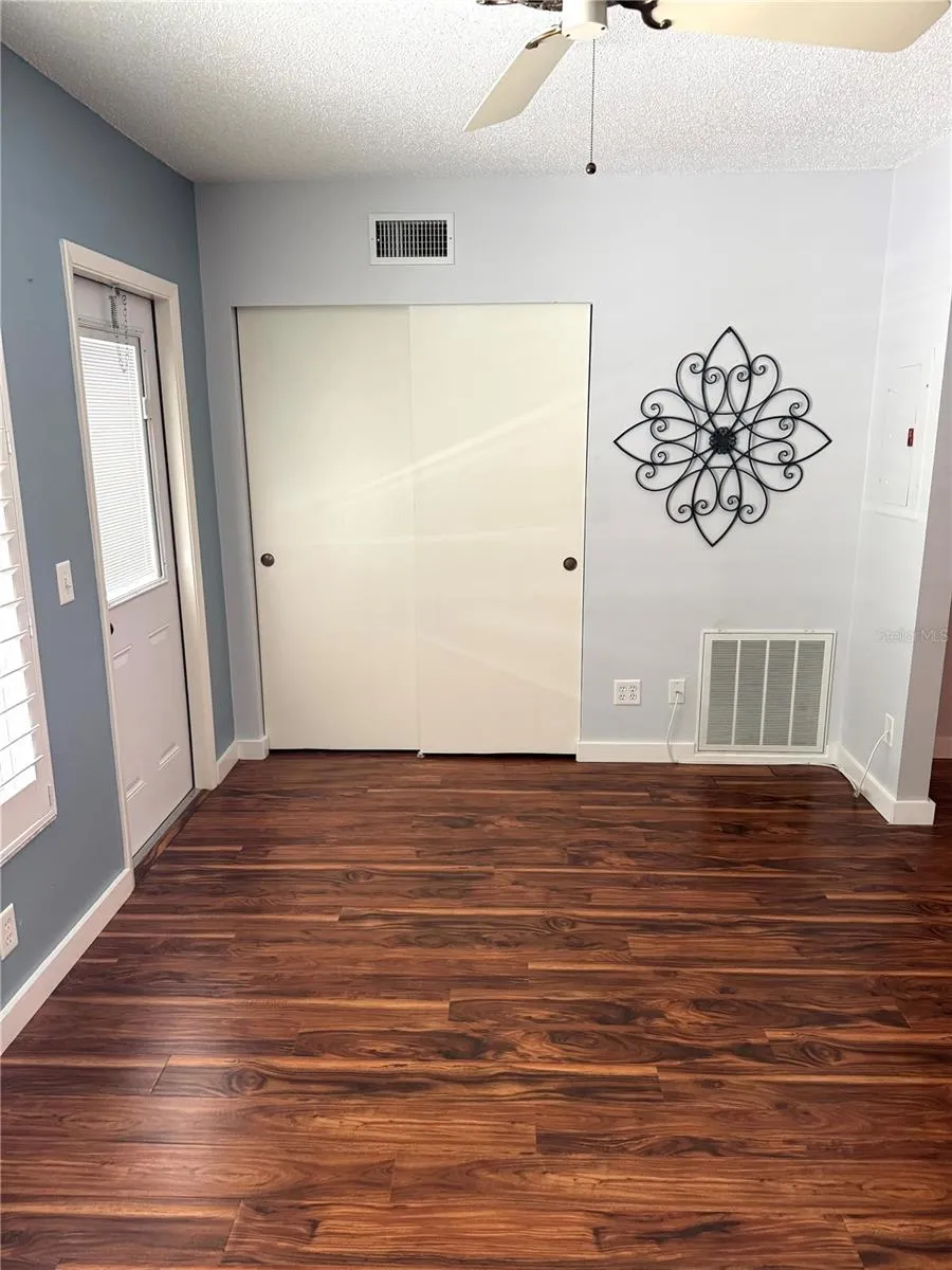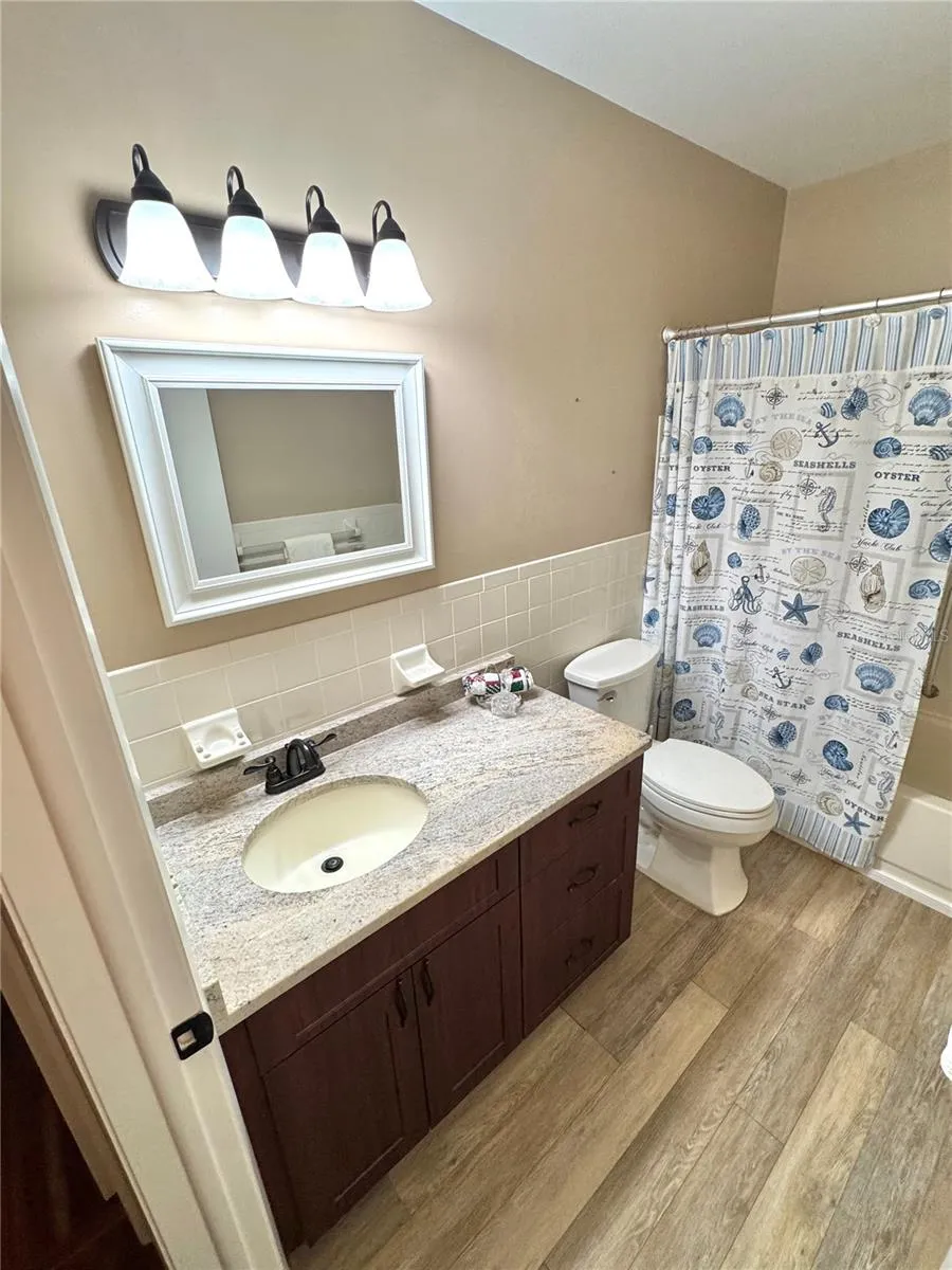 HUGE PRICE REDUCTION on this HIGHLY SOUGHT AFTER UPDATED GROUND FLOOR 1415 square foot CONDO. HIGH-END UPGRADES from front to back. IMPACT-RATED insulated windows with PLANTATION SHUTTERS, high quality shaker cabinets, granite counters and stainless steel appliances that include a built in microwave oven. Gorgeous and functional granite island with breakfast bar in kitchen. The kitchen has been opened up to the dining area and family room. There is a large pantry closet in entry hallway. The A/C system was replaced in 2016. Enjoy the look and feel of upgraded hand-scraped looking laminate flooring in all the non-wet area and luxury vinyl plank flooring in the kitchen and bathrooms. Updates in both bathrooms. Huge master bedroom with tons of closet space. Huge 10′-26′ lanai with aluminum railing and insulated aluminum panel roof overlooks spacious park-like green shady courtyard. Upgraded door to the lanai has integrated blinds inside. You will spend a lot of time out there when you are not at one of the two community pools, two clubhouses, two golf courses, 175 different clubs, 4 tennis courts, gym, fitness center, dog park, 2 horse shoe pits, 2 pickleball courts, 6 lawn bowling courts, 8 shuffleboard courts and two lakes for fishing. There is no place like OTOW. The utility closet is wired for a clothes dryer. A Community laundry room and shared storage room is on the second floor in the elevator core down the walkway.