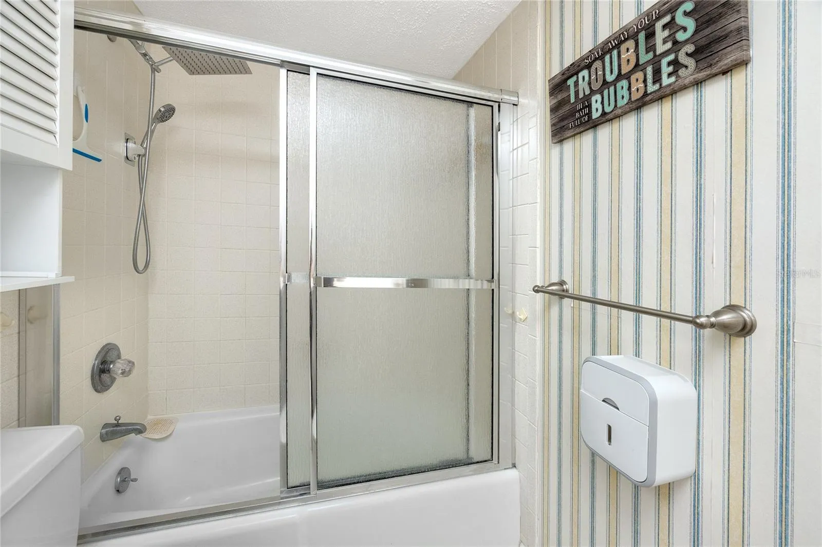 The oversized master bedroom offers a large window with scenic views, and en suite bathroom with dual sinks, great lighting, and a walk-in closet. The guest bedroom and bath are well-appointed, and a private laundry room with a full-size washer/dryer provides added storage and convenience.