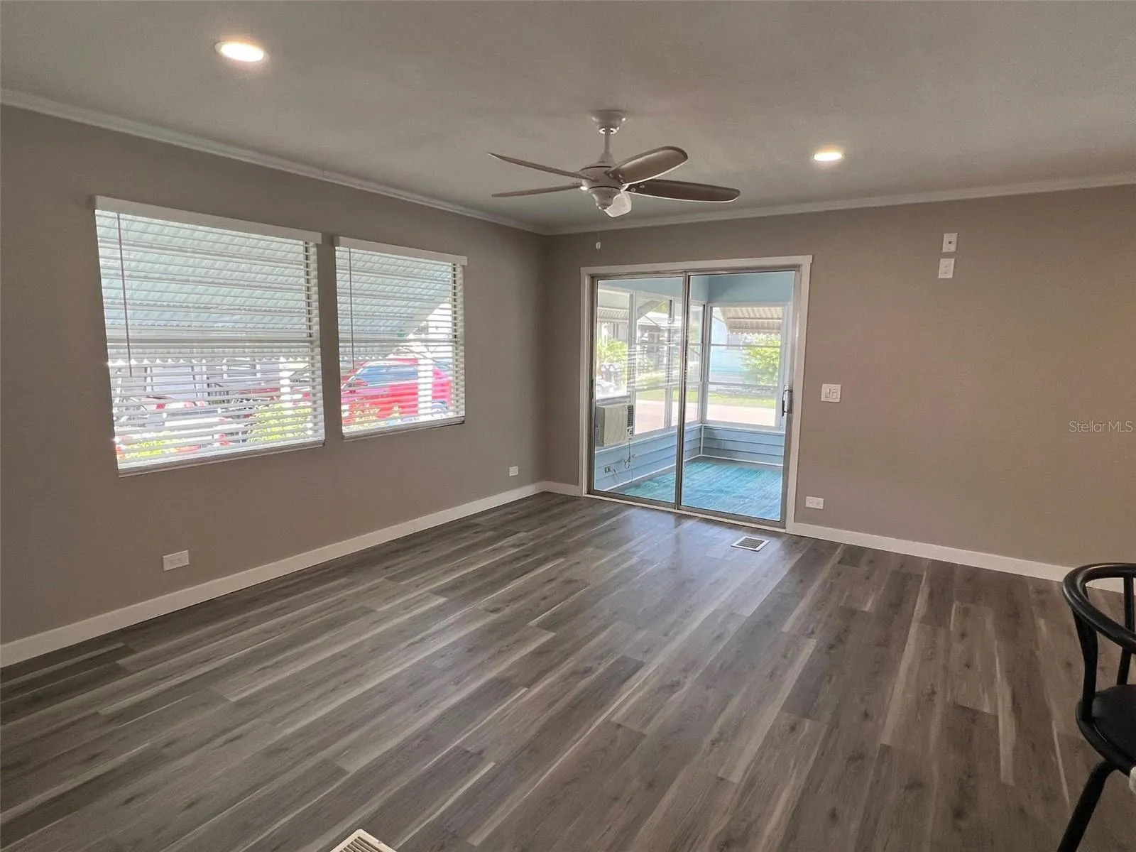 This beautifully remodeled residence is a true showpiece, designed for both style and comfort. Featuring two spacious bedrooms and two modern bathrooms, the home has undergone a complete renovation in 2025 to create a move-in-ready masterpiece. The brand-new kitchen is a chef’s dream, boasting stainless-steel appliances—including refrigerator, range, oven, dishwasher, and ice maker—paired with stunning granite countertops, a trendy backsplash, a center island ideal for meal prep or casual dining, and abundant cabinetry for all your storage needs. Other interior highlights include dimmable recessed lighting, new ceiling fans, central heat and air (2016) with warranty, sleek vinyl plank and plywood flooring, drywall throughout, and elegant six-panel doors. The open floor plan seamlessly flows from the dining room to the spacious living room, which connects to an air-conditioned raised Florida room. The luxurious master suite offers porcelain tile flooring, a cozy window seat with a built-in safe and an en suite spa-like bathroom with grab bars, a decorative tiled walk-in shower and touchless toilet. The guest bedroom is equally impressive with generous space, high-end vinyl plank flooring, a granite vanity, a beautifully tiled shower, and even a heated Jacuzzi tub for ultimate relaxation.