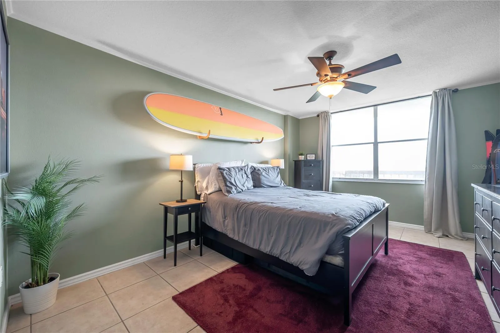 The updated kitchen is a standout, designed with both functionality and aesthetics in mind. It features solid wood cabinetry, slate tile countertops, modern lighting, and not one, but two pantry closets — ideal for organized living. Adjacent to the kitchen, the dining and living spaces flow effortlessly, all unified by oversized ceramic tile flooring and elegant crown molding throughout.