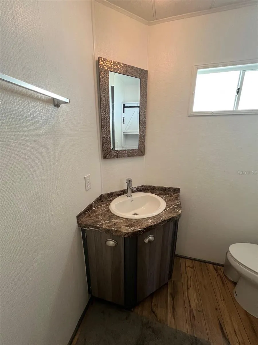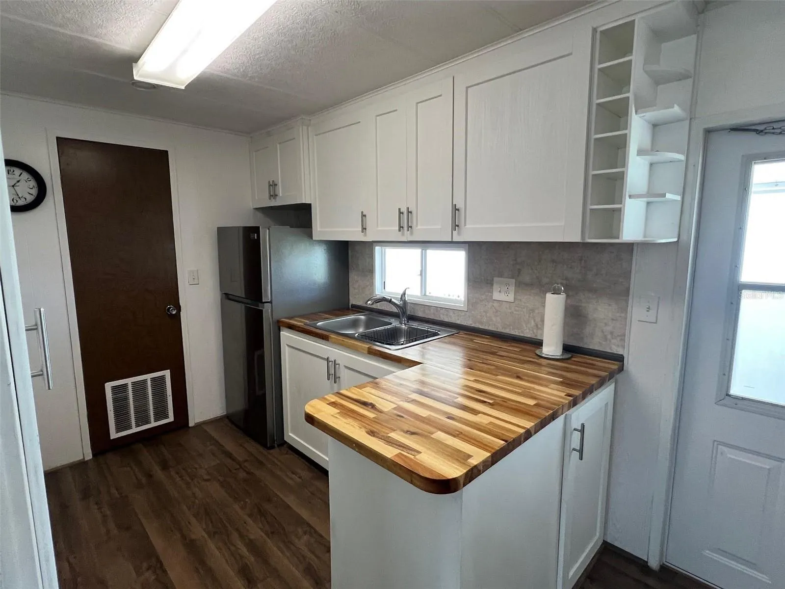 Positioned on a desirable corner lot, this spacious double-wide residence is offered fully furnished. The interior features a well-conceived split floor plan that balances privacy and shared living, with open, sunlit rooms creating an inviting atmosphere upon entry. Durable laminate flooring extends through the home, enhancing upgraded windows, and the efficient central heating and cooling increase the appeal of the home. The functional kitchen, highlighted by new upper cabinetry, butcherblock countertops, a peninsula for additional workspace, and a large storage closet suitable for daily necessities. Adjacent to the kitchen, the dining area can accommodate a full-sized table, ideal for gatherings. The generously proportioned living room includes a modern accent wall and ample space for entertaining or relaxation. The sun-filled raised Florida room increases natural light, offering flexible space for recreation, conversation, or quiet pursuits. A front bedroom features an ensuite bathroom with a walk-in shower, while the main bathroom offers a large vanity, extensive cabinetry, and a second walk-in shower. At the rear of the home, an expansive bedroom is designed for optimal storage with four full-sized closets and four overhead cupboards, making it especially well-suited for those who value organization and storage solutions.