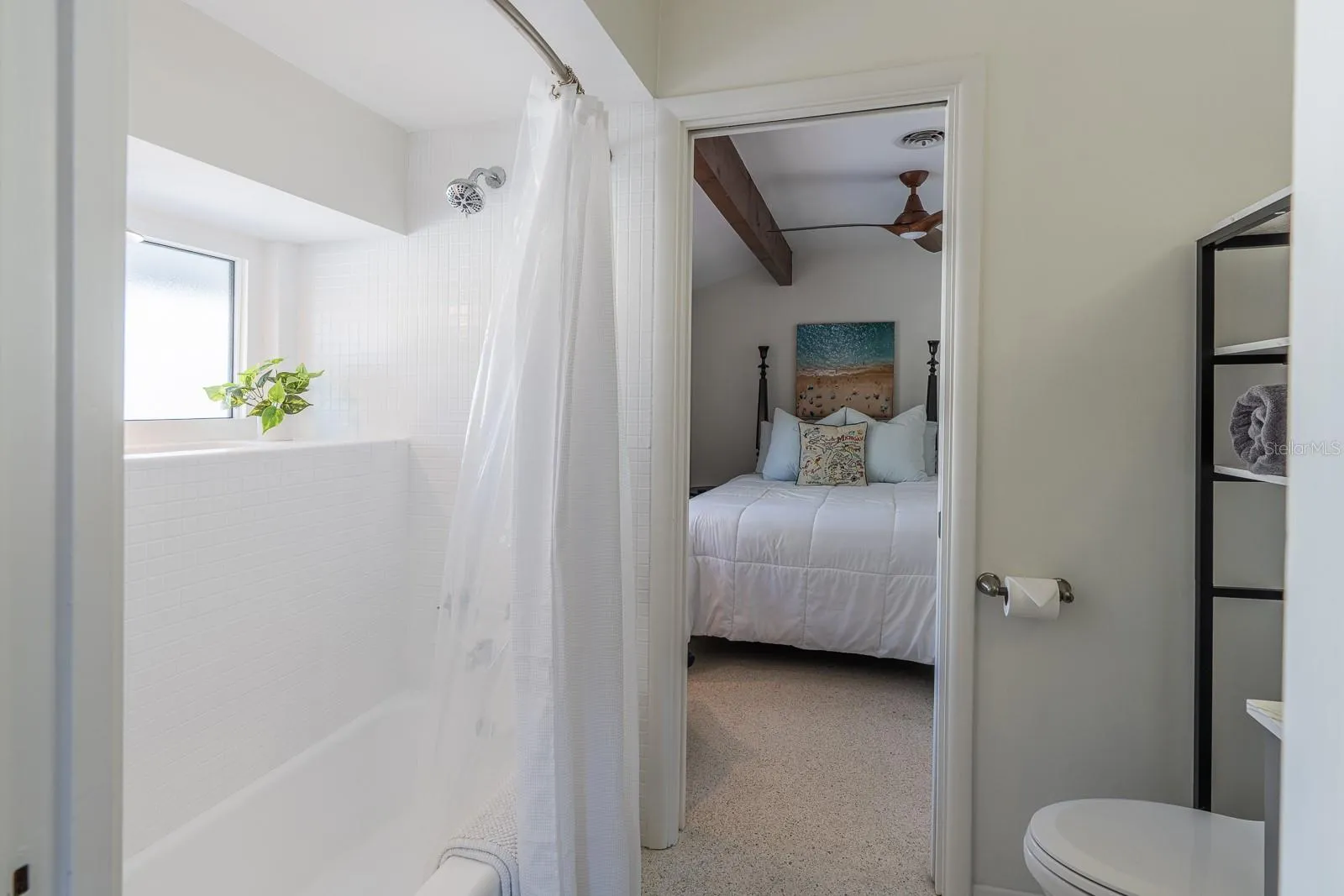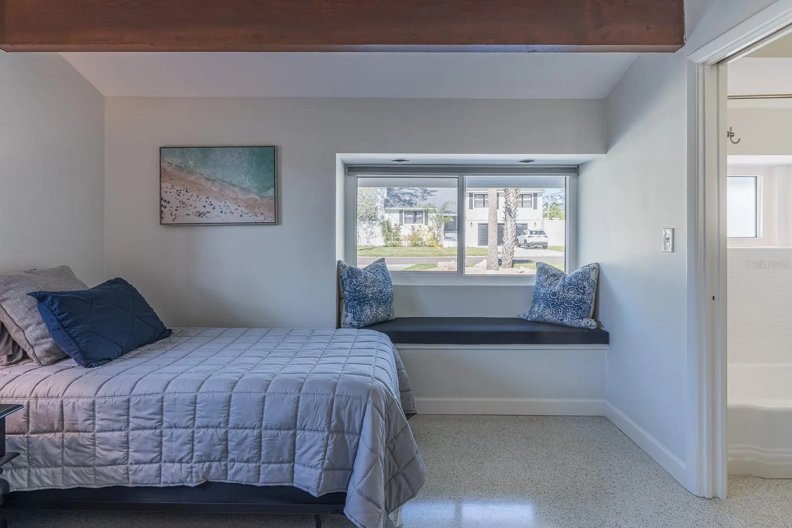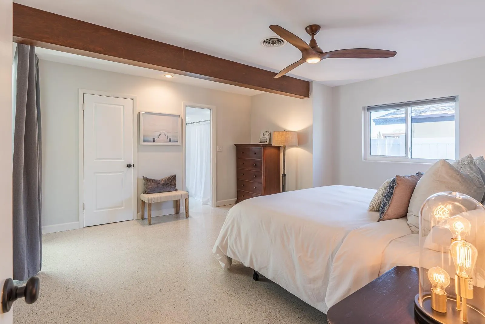 retreat, featuring a walk-in closet, an impeccable master bathroom, and sliding doors leading to the Florida room. The original wood beams