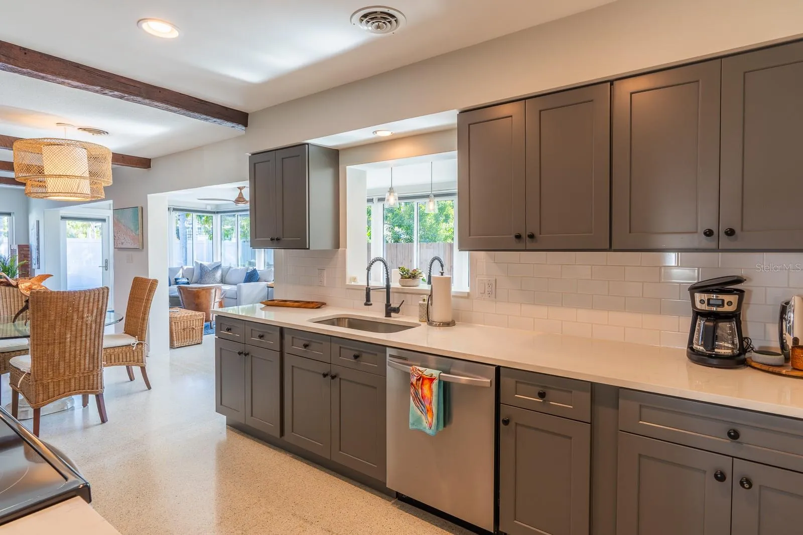 designed kitchen features quartz countertops, high-quality wood cabinetry, and a seamless connection to the home’s airy and bright Florida