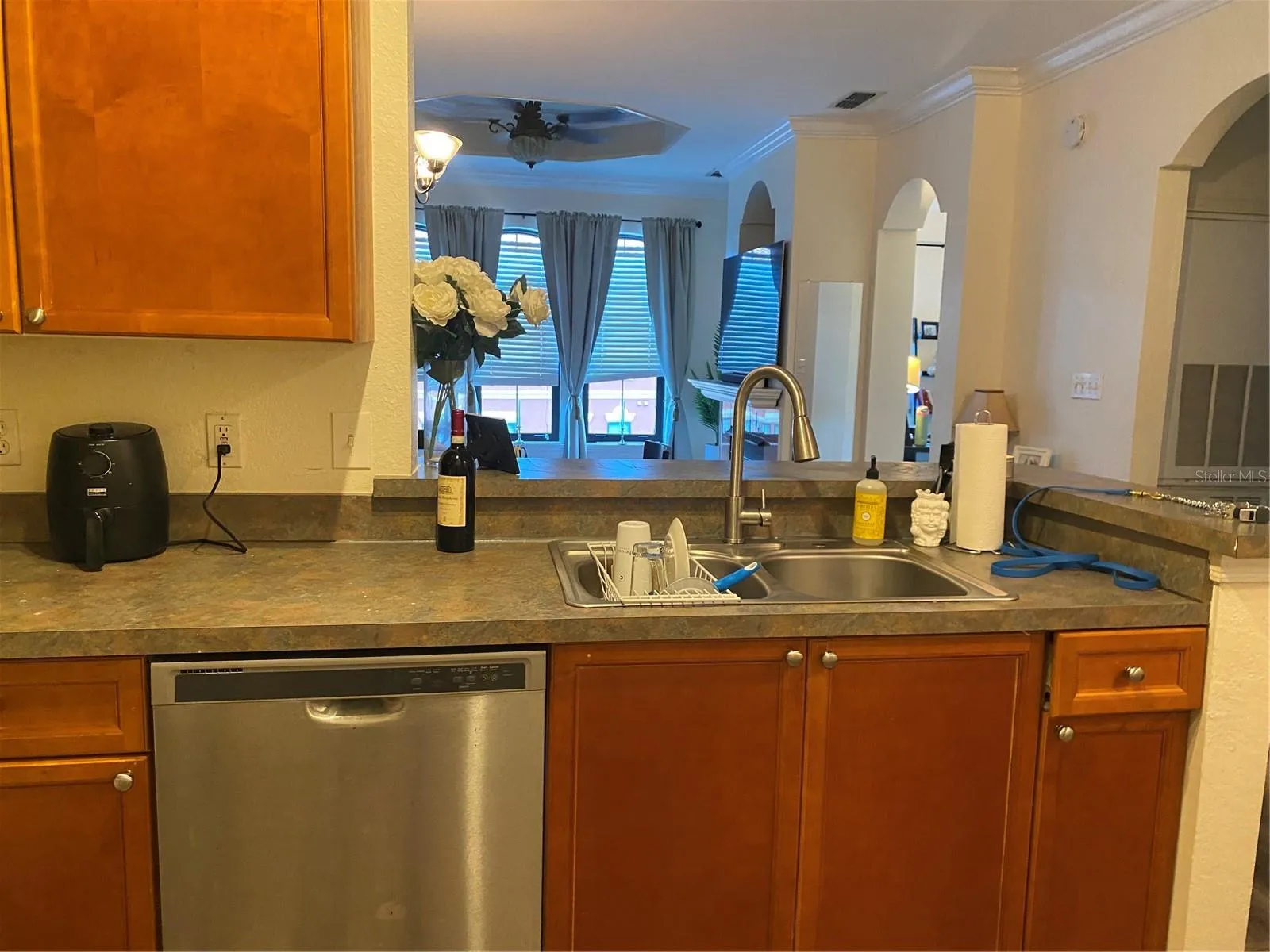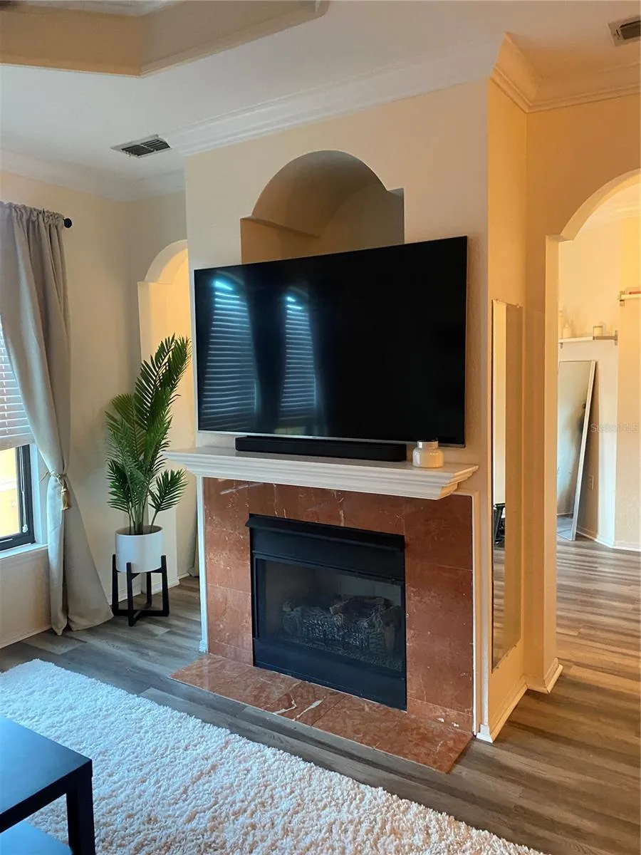 throughout. The living, dining & master bedroom area features crown molding. The living area has coffered ceiling, updated ceiling fan and a