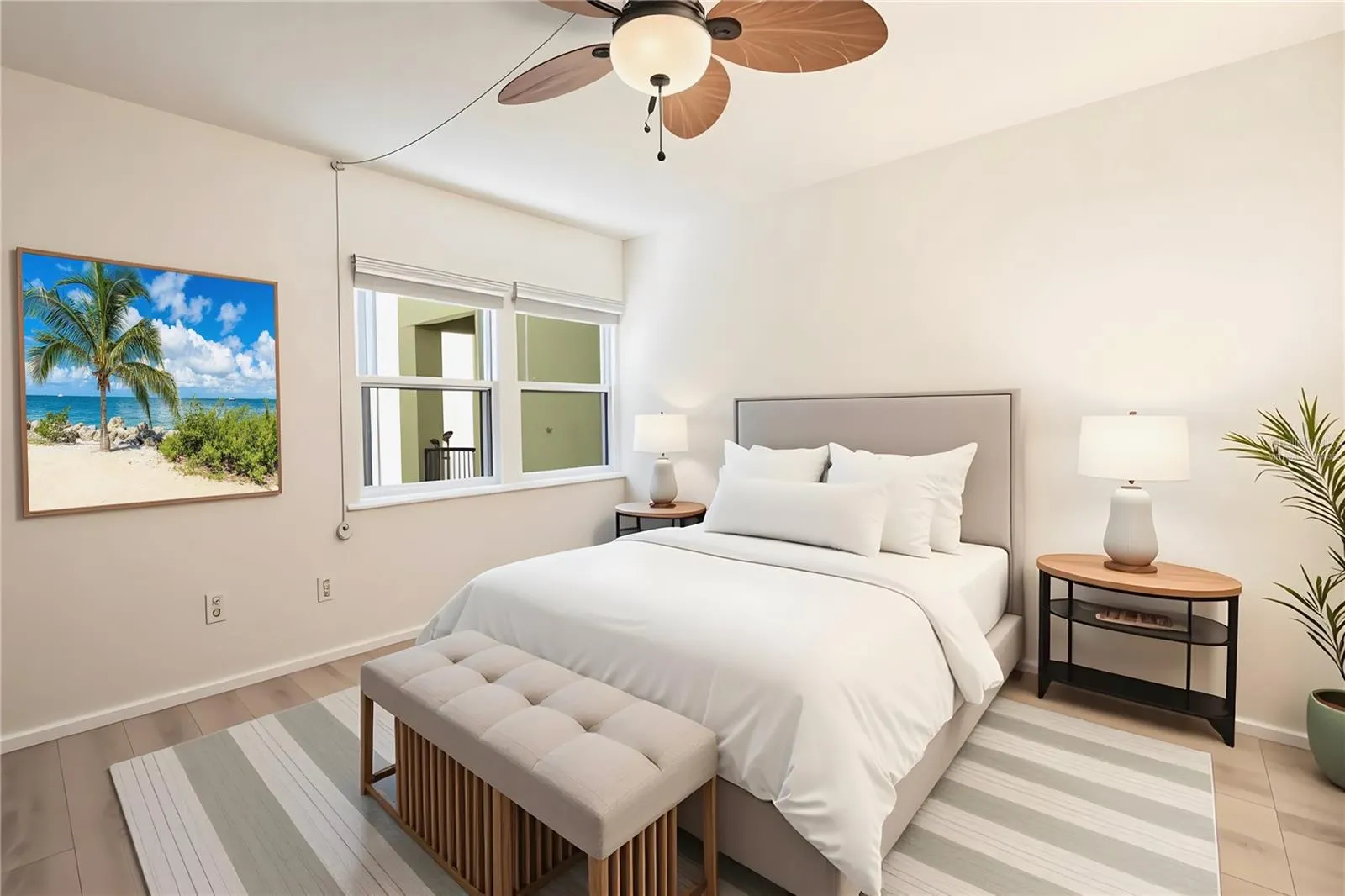 The updated bedroom includes not only the luxury flooring but also new PGT hurricane windows, while the bathroom features a refinished tub and tile surround, a new shower head, a new vanity with fixtures, and modern light fixtures, creating a fresh, spa-like retreat.