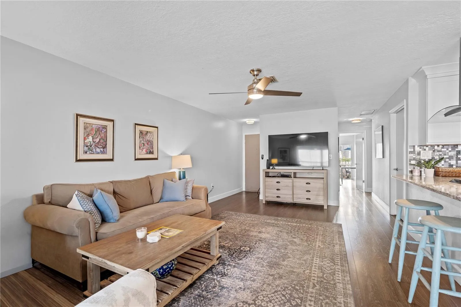 Step inside to an inviting open-concept floor plan filled with natural light. The updated kitchen is a standout feature with granite countertops, ample bar seating, white cabinetry, a stylish backsplash, and stainless steel appliances including a vent hood. Just off the kitchen, a cozy dining nook provides the perfect space for everyday meals or casual entertaining.