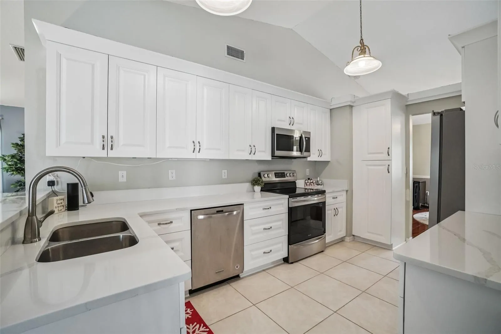 This four-bedroom, three-bath single-story home features a functional split-bedroom layout with vaulted ceilings and multiple living areas arranged for everyday use and flexibility. The kitchen was updated in 2021 and includes white shaker cabinetry, solid-surface countertops, stainless steel appliances, and an open connection to the main living area. A formal dining room and separate family room with a wood-burning fireplace provide defined spaces while maintaining flow throughout the home.