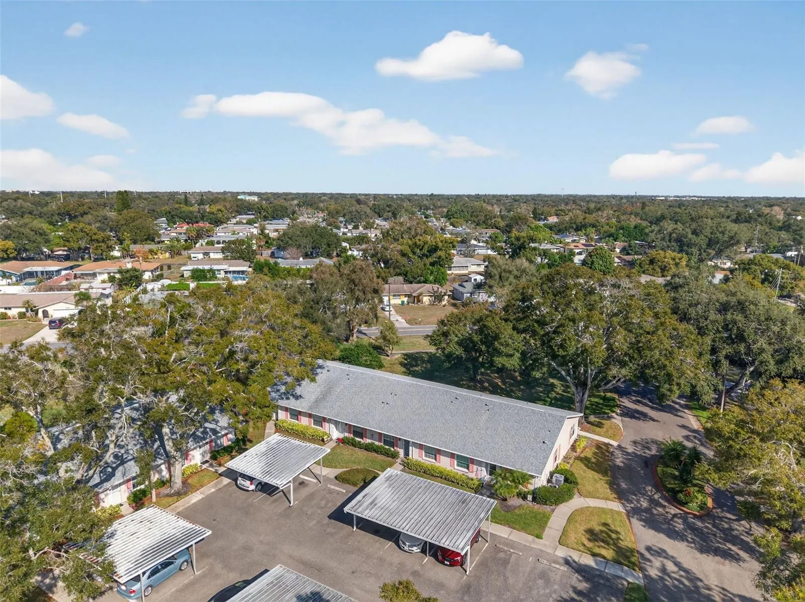 Immaculately kept and move-in ready, this rare corner unit condo is located in the highly desirable 55+ community of Nelson Place, offering the very best of Florida living. Residents enjoy beautifully landscaped grounds with mature foliage and a sparkling community pool. This 2-bedroom, 2-bath, 1,044 sq ft home features luxury vinyl plank flooring (2024) throughout and stunning French windows in every room, complemented by plantation shutters and storm windows that enhance both style and energy efficiency. The inviting kitchen offers new white shaker cabinets, tasteful nickel hardware, a Kohler sink with Delta faucet, all newer appliances, and the confidence of a hot water heater replaced in 2024. A breakfast bar seating four makes this space ideal for entertaining. The open-concept living and dining area boasts an impressive vaulted ceiling and abundant natural light. The spacious primary suite includes a large walk-in closet and an en-suite bath with double vanity. The second bedroom features a generous 6’ x 4’ walk-in closet and is adjacent to a full bath with new Corian vanity and tub/shower combo. Additional highlights include a large Florida room with a utility closet housing side-by-side GE washer and dryer, perfect for a home gym, hobby space, or enjoying your morning coffee. Step outside to a paver patio overlooking mature trees that provide peaceful views and cooling shade. Conveniently located just minutes from Publix, shopping, restaurants, banks, and the Pinellas Trail. Schedule your showing today—this one won’t last!
