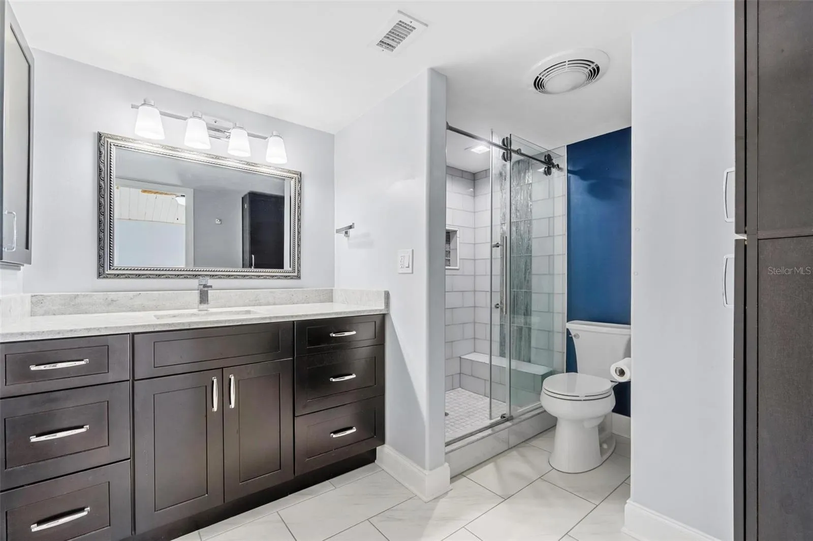 The updated kitchen offers sleek stainless-steel appliances, stone countertops, soft-close cabinetry, and under-cabinet lighting—perfect for everyday cooking or entertaining. Both bathrooms have been tastefully remodeled, with the primary bath featuring a bath fan with heat and light.
