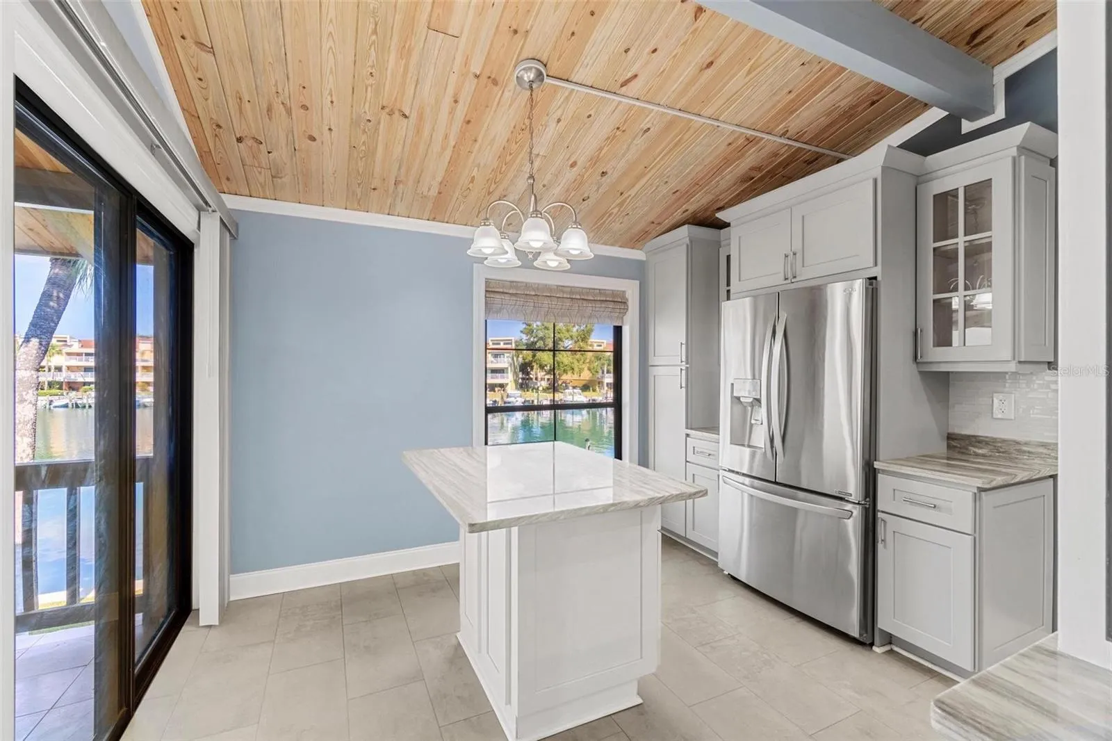 Step inside to a bright open floor plan featuring luxury vinyl flooring throughout, fresh paint, custom shades, and stunning pine vaulted ceilings that bring warmth and character to the living space. Both bedrooms are accented with beautiful cedar-planked ceilings and generous closet storage, enhancing the home’s cozy charm and relaxed coastal atmosphere.